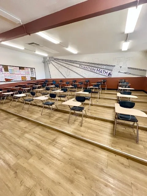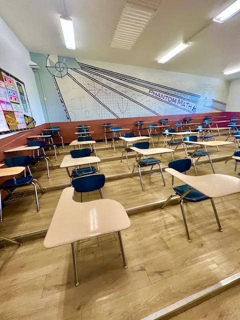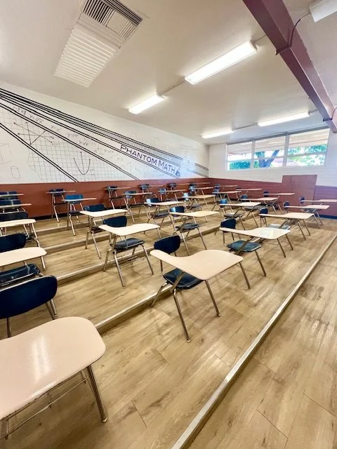 Bus | Cafeteria | Classroom 1 + Trophy Hallway | Classroom 2 + Outdoor Courtyard | Classroom 3 + Outdoor Courtyard | Classroom 4 | Colorful Classroom 5 + Hallway | Colorful Science Classroom 6 + Hallway | Courtyard | Green Lawn | Gymnasium | Theater